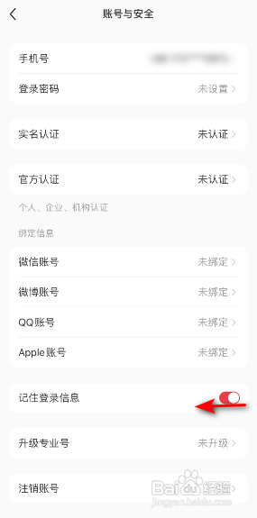 3、然后将记住登录信息的滑动按钮向左滑动,滑动完成后便可以关闭记住登录信息。